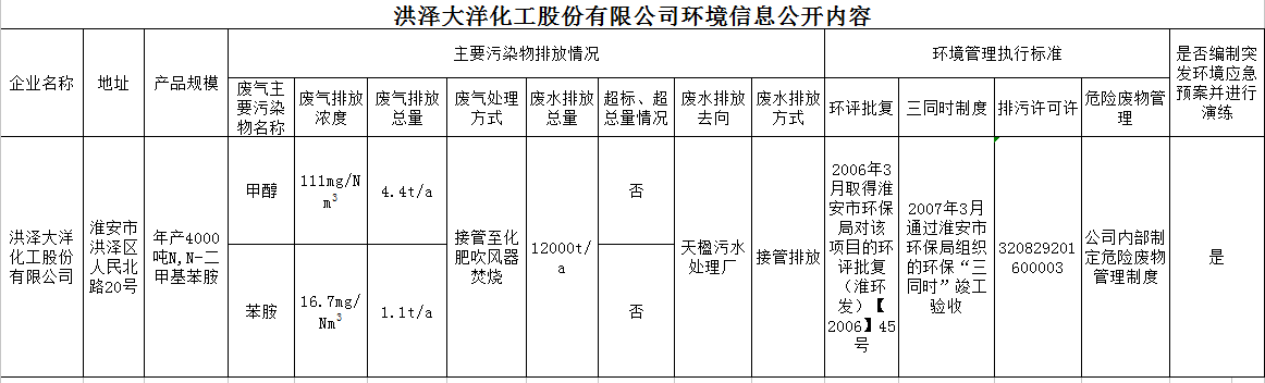洪泽大洋化工股份有限公司环境信息公开内容