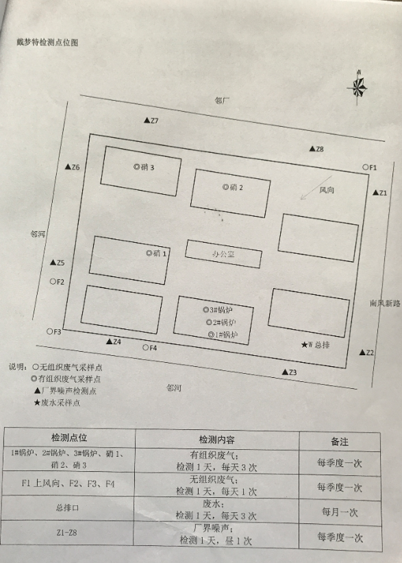 我公司污水处理厂处理项目有两套处理设施,设计生产能力为1000T/d,但因戴梦特下属各生产厂积极进行技术改造,实际处理量仅为300T/d左右。有—个污水排污口,并在污水排口安装流量计和COD及氨氮自动监测设施,并和市县环保部门联网运行,设立明显标识,污水处理达标后排入园区污水管网,接管到区污水处理厂再处理;厂区有污泥存储场所,作为危险废物管理,并与有资质单位签订处置合同。公司自备热电厂装有烟气在线监测装置。其他污染因子我公司与有资质监测单位签订监测合同,根据排污许可证要求进行监测。