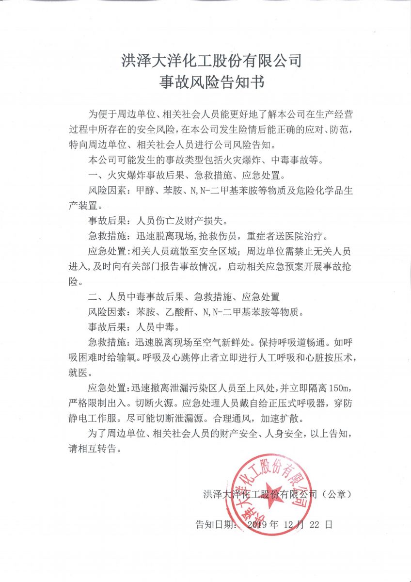 洪泽大洋化工股份有限公司事故风险告知书