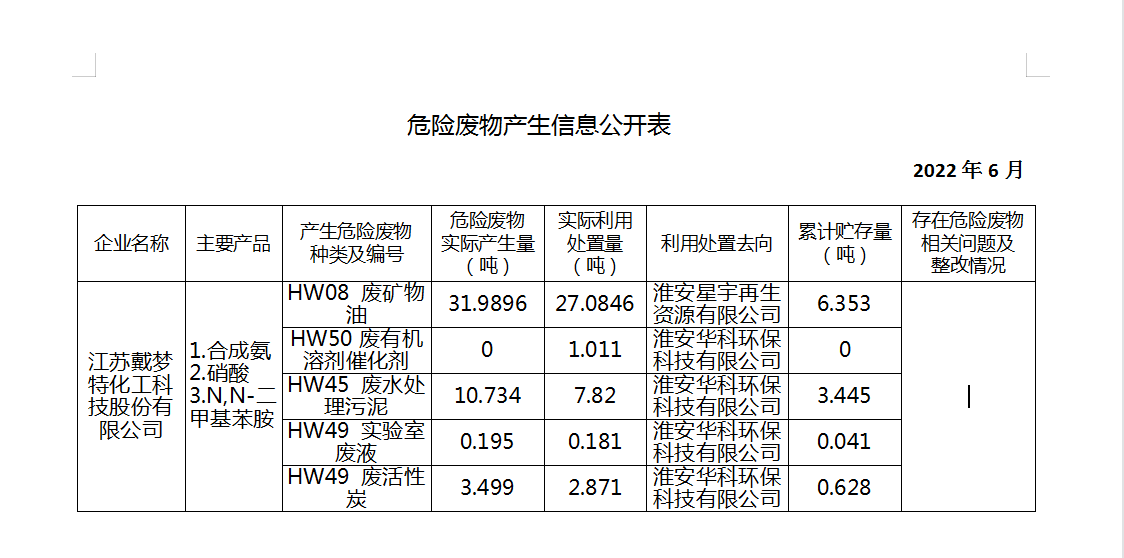 戴梦特公司2022年6月危废信息公开表